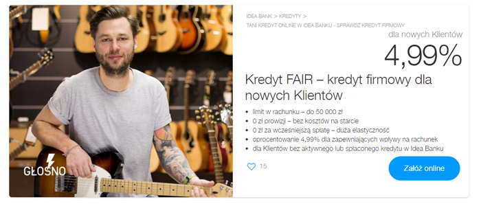 Ze specjalną promocyjną ofertą dla nowych klientów, wystartował właśnie Idea Bank. Uruchamiając ofertę Kredyt FAIR z oprocentowaniem 4,99%. Jest to kredyt uruchamiany w postaci limitu w rachunku firmowym. Nawet do 50 000 zł, bez kosztów na starcie z 0 zł prowizji. Nowa oferta finansowa Idea Banku – Kredyt Fair powinna zainteresować szczególnie firmy, które jeszcze […]